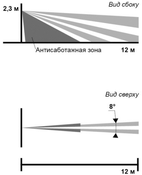 Оптико-электронный уличной установки, степень защиты оболочки IP54, дальность 12м (поверх), питание 9…30В, диапазон температур -40…+50°С.