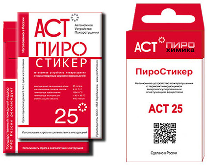 ПироСтикер АСТ 25 - автономная установка пожаротушения с микрогранулами ОТВ (антипиренами) предназначается для подавления возгораний в объемах (до 25 литров/ 0,025 м3) таких как: распределительные щиты, электрошкафы и панели управления, сейфы, хранилища ценностей, блочно-модульные топливохранилища и прочие объекты со степенью защиты (IP-20 и выше) (в том числе на стационарных объектах, подвижном составе и.т.п., в жилых помещениях и на социальных объектах с постоянным или временным пребыванием людей).