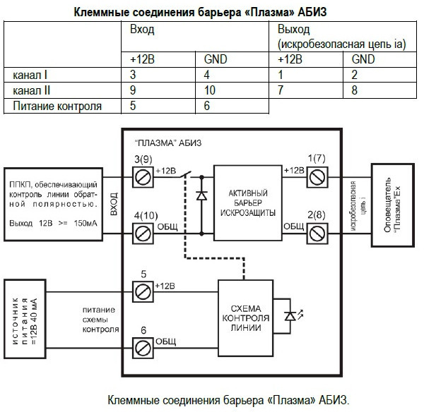 ПЛАЗМА-Ехi-АБИЗ-C - активный барьер искрозащиты с 2-мя кабельными вводами взрывозащищённый (ExibGbIICX/ExibMbIX/ExibDbIIICX) в пластмассовом корпусе, на 1 канал, степенью защиты (IP54) предназначен для обеспечения искробезопасности и однополярного питания табло оповещения типа (Плазма-Ехi-С) максимальным рабочим напряжением (до 20В) с уровнем искрозащиты «ib» для взрывозащищенного электрооборудования групп - I и II по ГОСТ 31610.11-2014 (IEC 60079-11:2011).