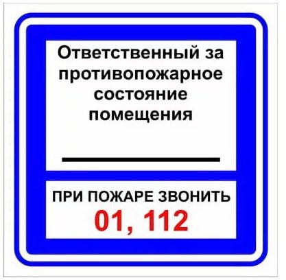 Знак ответственный за противопожарное состояние помещения, о пожаре звонить 101, 112.