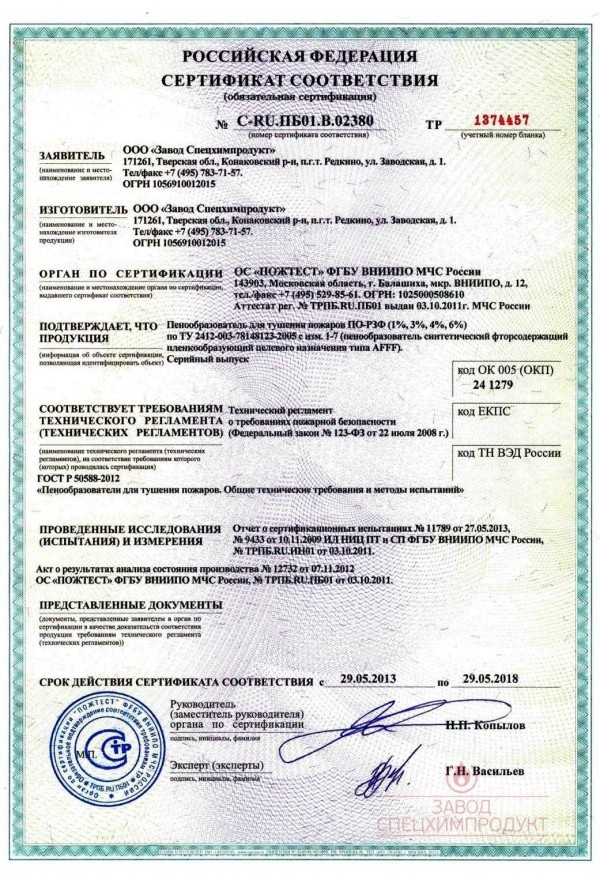 Пенообразователь- синтетический фторсодержащий плёнкообразующий пенообразователь (пенный концентрат) целевого назначения, предназначенный для тушения пожаров классов А и В пеной низкой, средней и высокой кратности.Предназначен для применения в автоматических и стационарных системах пожаротушения при тушении пожаров минеральных и синтетических масел, а также нефти и нефтепродуктов всеми известными методами, включая метод подачи пены в резервуар под слой горючей жидкости (подслойное тушение). Поставляется строго в бочках. Объем 200 кг.