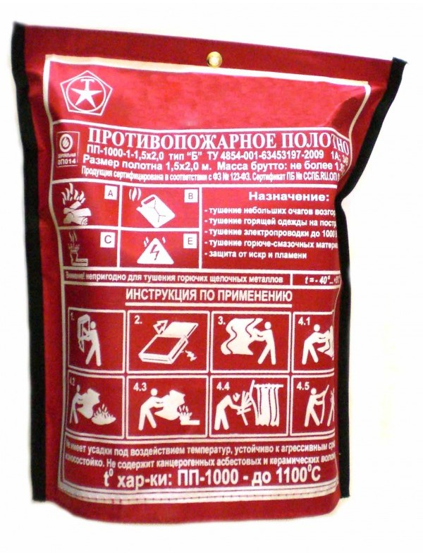 ПП-1000 1,5х2,0 - полотно (кошма) противопожарное в специальном чехле огнестойкое (до +10000С) гибкое, повышенной прочностью, из стеклоткани (ЭЗ-200) предназначено для эффективной нейтрализации локального горения материалов на ранней стадии пожара, для защиты при проведении огневых работ, хорошо противостоит воздействию грибков и вредоносных микроорганизмов, обладает устойчивостью к щелочам и слабым кислотам, входит с состав комплектации пожарных щитов.