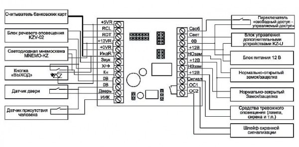 Контроллер ограничения доступа к банкомату. Позволяет подключать считыватель банковских карт, электроуправляемый замок/защелку, датчик открытия двери, датчик присутствия клиента, светодиодную мнемосхему занято-свободно , блок управления дополнительными устройствами KZ-U (освещение и видеозапись), блок речевого оповещения KZ-V02, шлейф охранной сигнализации, систему оповещения о пожаре, местные средства тревожного оповещения, переключатель свободный доступ - управляемый доступ .