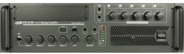 PS-3120 - трансляционный настольный и встраиваемый в 19" стойку/шкаф 5-зонный с 6-и ступенчатыми аттенюаторами микшер - усилитель выходной мощностью 120 Вт, встроенными: вентилятором охлаждения, 2-х полосным эквалайзером предназначен для микширования и усиления звукового сигнала с целью его дальнейшей трансляции на громкоговорители 8 Ом или с питанием 70/100 В.