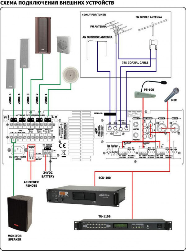 - Подключение микрофонного пульта персонального вызова PS-100.