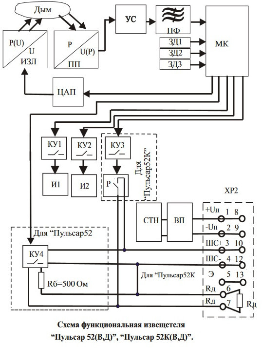 ИП 212-52 "Пульсар 52" - точечный бескамерный дымовой 4-х проводный оптикоэлектронный пожарный извещатель, токопотребляющий, восстанавливаемый (многократного действия), обычного исполнения предназначен для обнаружения загораний и передачи на ППКОП сигнала тревожного сообщения (Пожар) за счёт превышения порога задымления.