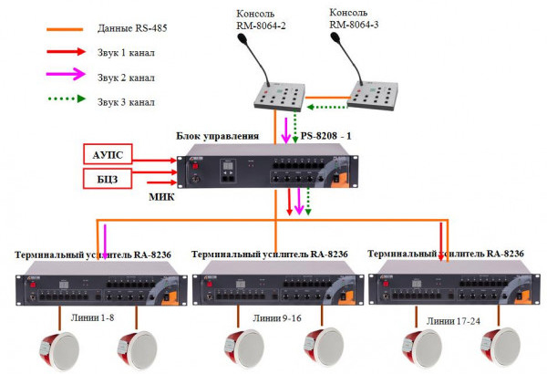 В составе системы может присутствовать до 64 терминалов RA-8236, на базе которых может быть реализована трехканальная 16-ти приоритетная, 512-ти зонная система оповещения с возможностью дистанционного контроля и управления.
