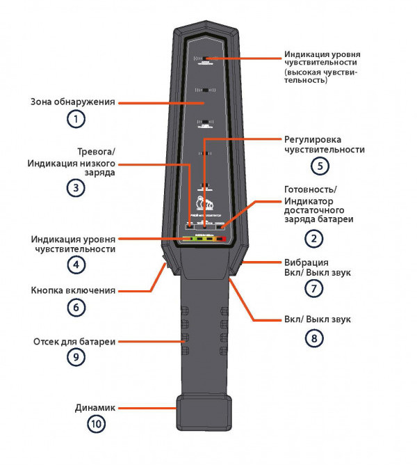 Ручной металлодетектор. Ударопрочный корпус. Световое и звуковое оповещение. Диапазон рабочих температур от -15 до +60 C