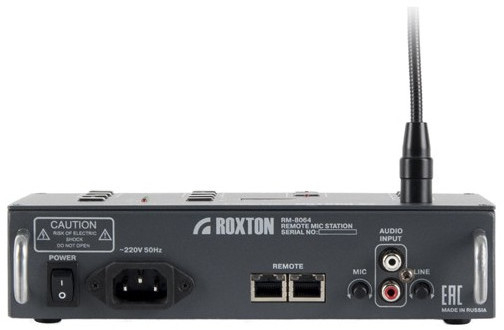 ROXTON RM-8064 - настольная микрофонная консоль для дистанционного управления комбинированной ситемой RA-8236 совмещает в себе функции селектора зон и микрофона и предназначена для выбора нужных зон, передачу в них речевого сообщения с микрофона, а также с музыкального аудио входа, расположенного на задней панели.