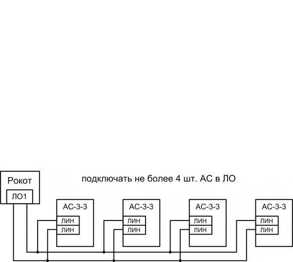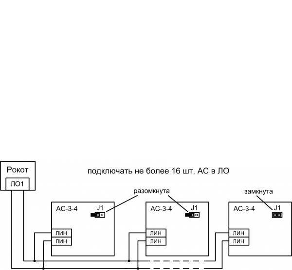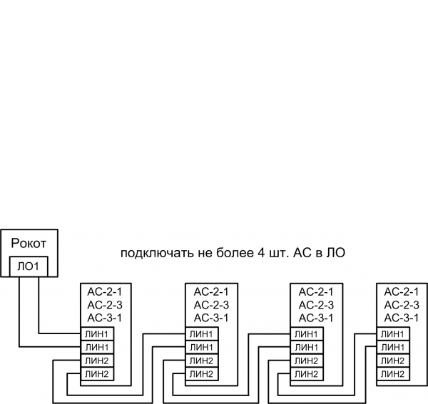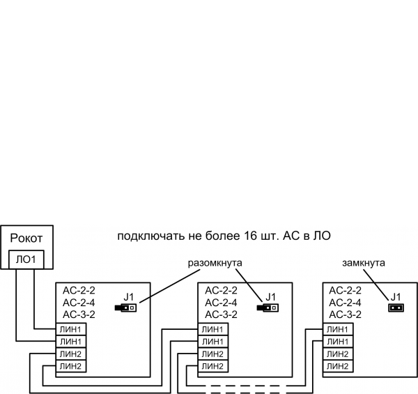 - Прибор имеет выход оповещения, к которому могут быть подключены до 4 АС типов: «АС-2-1», «АС-2-3», «АС-3-1», «АС-3-3» или до 16 АС, имеющих высокое входное сопротивление: «АС-2-2», «АС-2-4», «АС-3-2», «АС-3-4».
