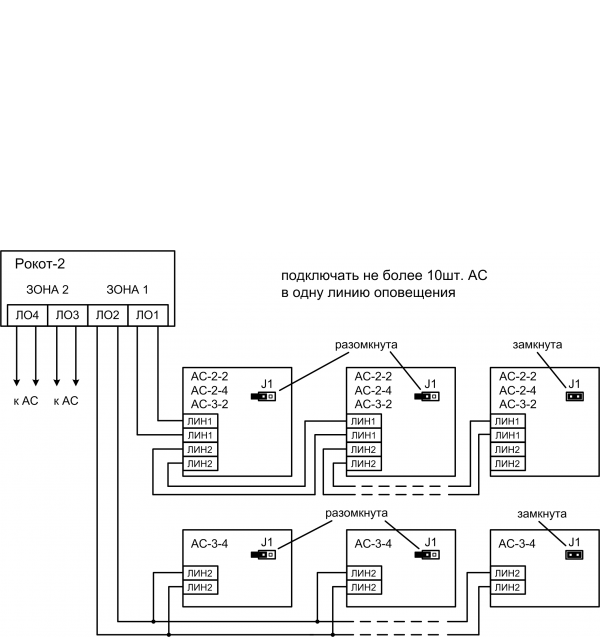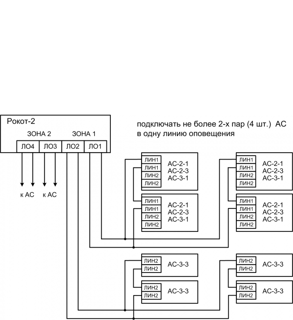 Прибор работает с акустическими системами «АС-2-1», «АС-3-1», «АС-3-3», «АС-2-2», «АС-3-2», «АС-3-4», «АС-2-3» и«АС-2-4», подключёнными с помощью соединительных линий (линий оповещения).