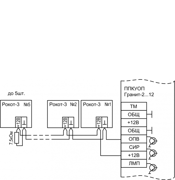 - Воспроизведение сообщений синхронизировано, поэтому имеется возможность подключать к управляющему прибору несколько Рокот-3 для совместного оповещения.