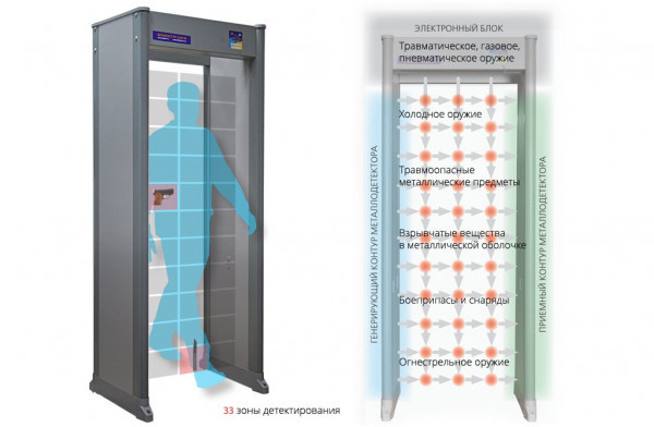 РС-3300М - стационарный арочный металлодетектор имеет 33 (тридцать три) взаимно перекрывающихся зоны, формирует одновременные сигналы тревоги от мультизон и предназначен для использования в учебных учреждениях, детских садах, кинотеатрах, музеях, цирках, магазинах и т.д.