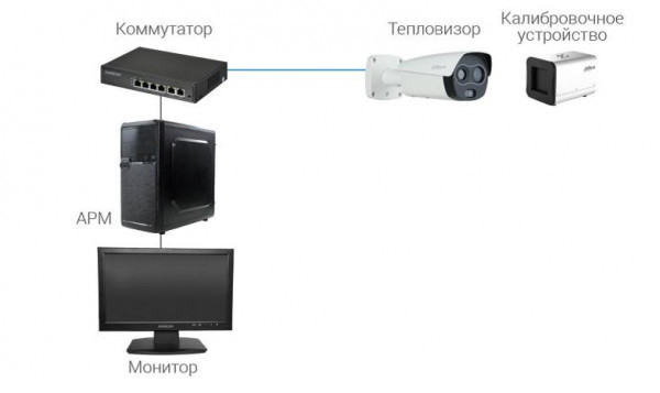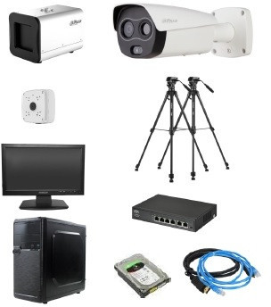 Тепловизор, калибровочное устройство, штативы, адаптеры к штативам, кабели, коммутатор, рабочая станция с ПО RVi Оператор с HDD, лицензии для Оператора , монитор.