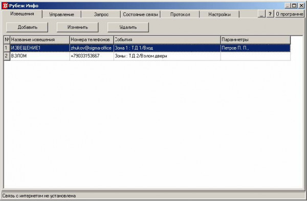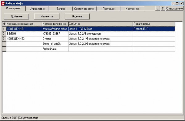 Рубеж Инфо - программное обеспечение, которое предназначено для оповещения, управления и запрос состояния через SMS, E-Mail.