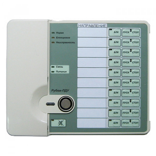 РУБЕЖ-ПДУ - пульт дистанционного управления предназначен для дистанционного управления (10 направлений) одним или группой исполнительных устройств, подключенных в АЛС (адресные линии связи) одного или нескольких приемно-контрольных приборов «Рубеж-4А», «Рубеж-2ОП», ППКПУ серии «Водолей».