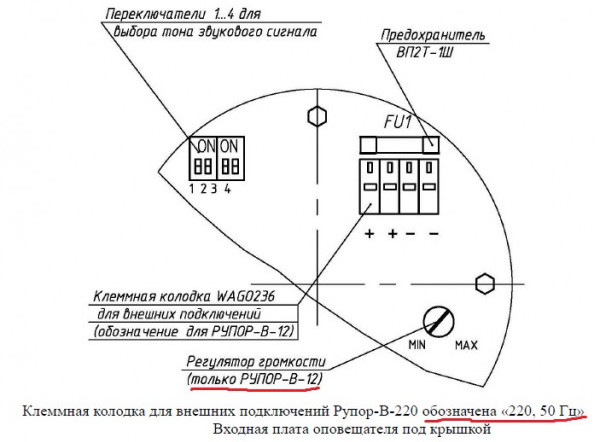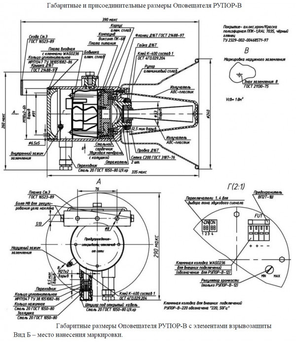 Рупор-В-220-К - оповещатель рупорный пожарный взрывозащищенный (1ExdbIIBТ6GbX), звуковой (102 - 116 дБ - регулируются, управляемых 16 тонов с помощью DIP- переключателя. и включением через клеммы зажимные "Wago" по схеме: при подаче напряжения питания от 187 до 243 В), степенью защиты (IP54), встроенным усилителем мощности, с 2-мя кабельными вводами для открытой прокладки кабеля диаметром (8 - 14 мм) и уплотнительными резиновыми (ИРП-1347) кольцами (всё в комплектации), наличием регулятора громкости предназначен для подачи звукового сигнала в системах пожарной и охранной сигнализации при совместной работе с любыми приемно-контрольными устройствами и применяется на предприятиях химической, нефтегазодобывающей, нефтегазоперерабатывающей отраслей и взрывоопасных зонах (1 и 2 классов) других производств.