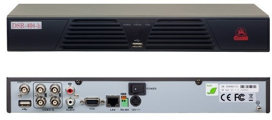 4-кан видео, 1 кан. Аудио (RCA). Видео вых Main, Spot, VGA, Аудио вых вх- RCA, H.264, Пентаплекс, 10 100 Mbit Ethernet, Разр. записи CIF 352x288 QCIF 176x144 - 100 к с, D1-704x576 - 50 к с, управление PTZ ,2-USB2.0, ИК-пульт, мышь, 1 HDD SATA (до 2 Tb каждый),12VDC, 315x230x45(ШхВхГ)
