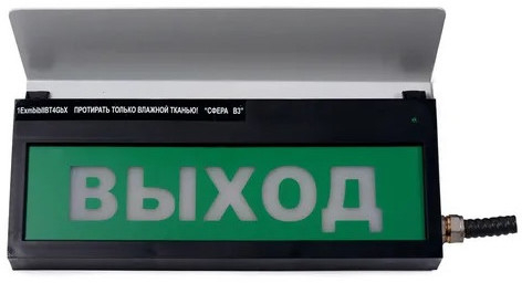 СФЕРА ВЗ, компл.03 Выход - оповещатель (Табло) "Выход" пожарный искробезопасный взрывозащищенный (1ExmbibIIBT4GbX), световой и звуковой (постоянный - свет, 100 - 110 дБ - непрерывный звук по схеме: подачей напряжения), напряжением питания (12 - 30 В и 198 - 220В), степенью защиты (IP65), с присоединённым кабелем (муфта с резьбой G1/2" на его конце) в металлическом гофрошланге длиной (1,5м; другой размер - под заказ), возможностью установки защитного козырька (приобретается отдельно) предназначен для подачи светового и звукового сигналов в системах пожарной сигнализации и автоматического пожаротушения при совместной работе с любыми приемно-контрольными устройствами и применяется на предприятиях химической, нефтегазодобывающей, нефтегазоперерабатывающей отраслей и взрывоопасных зонах (1 и 2 классов) других производств.