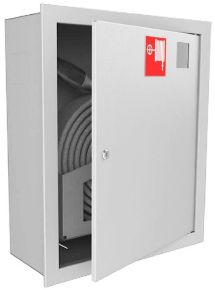 ШПК-310ВЗБ - шкаф пожарный для встраивания 2-ух запорных клапанов (вентилей) противопожарной водопроводной трубы и размещения в поворотной корзине 1-ого пожарного рукава длиною (20м) и условным диаметром (до 65мм), с встраиваемым типом установки, закрытый (без стеклянного смотрового окна на дверце), из стали, окрашенной порошковым методом в белый цвет, наличием почтового замка и кармана для хранения ключей.