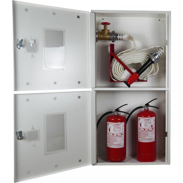 ШПК-320ВОБ - шкаф пожарный для встраивания 2-ух запорных клапанов (вентилей) противопожарной водопроводной трубы и размещения: в поворотной корзине 1-ого пожарного рукава длиною (20м) и условным диаметром (до 65мм), 2-ух переносных порошковых (от ОП-1 до ОП-9 ЯрПож), воздушно-пенных (ОВП-4, ОВП-8) или углекислотных (от ОУ-1 до ОУ-3) огнетушителей массой - не более 12 кг (каждый), суммарным габаритным размером (не более 540х230х650 мм), с встраиваемым типом установки, открытый (с наличием стеклянных смотровых окон на дверцах), из стали, окрашенной порошковым методом в белый цвет, наличием почтовых замков и карманов для хранения ключей.