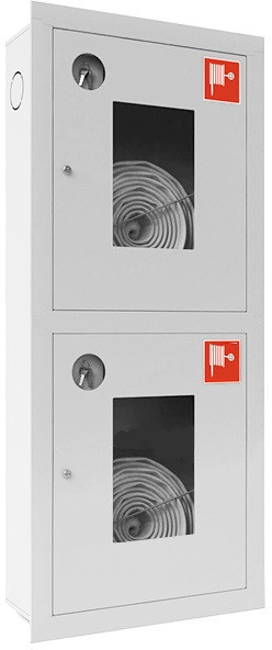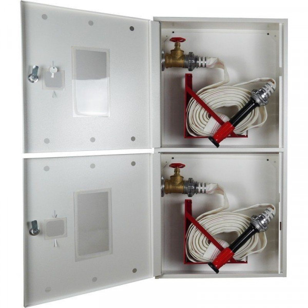 ШПК-320ВОБ-21 - шкаф пожарный для встраивания 4-ёх запорных клапанов (вентилей) противопожарной водопроводной трубы и размещения в 2-ух поворотных корзинах пожарных рукавов длиною (20м) и условным диаметром (до 65мм), с встраиваемым типом установки, открытый (с наличием стеклянных смотровых окон на дверцах), из стали, окрашенной порошковым методом в белый цвет, наличием почтовых замков и карманов для хранения ключей.