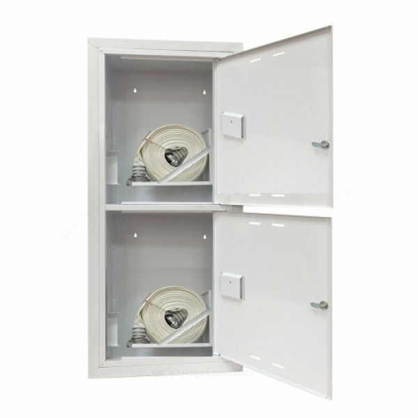 ШПК-320ВЗБ-21 - шкаф пожарный для встраивания 4-ёх запорных клапанов (вентилей) противопожарной водопроводной трубы и размещения в 2-ух поворотных корзинах пожарных рукавов длиною (20м) и условным диаметром (до 65мм), с встраиваемым типом установки, закрытый (без стеклянных смотровых окон на дверцах), из стали, окрашенной порошковым методом в белый цвет, наличием почтовых замков и карманов для хранения ключей.