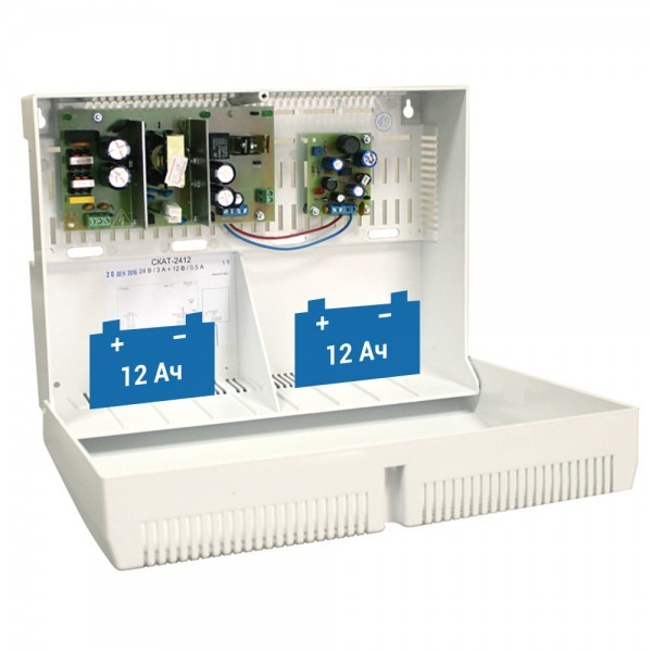 24В/2,5А, 12В/0,5А, корпус под 2 АКБ 12Ач сообщение Переход на резерв осуществляется с регулируемой задержкой. Соответствует ФЗ 123 и ГОСТ Р 53325-2009 3 индикатора и 3 информационных выхода - Сеть, АКБ, Выход, защита выхода от прегрузки и КЗ, защита АКБ от глубокого разряда, КЗ и переполюсовки, контроль наличия АКБ, холодный пуск.