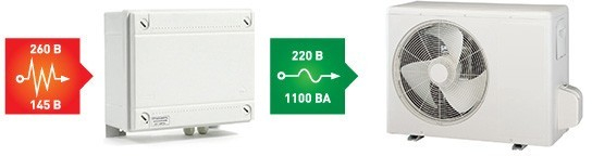 Стабилизатор напряжения уличного исполнения для сплит-систем до 9000 BTU. Номинальная мощность нагрузки 1100 ВА. Диапазон входного сетевого напряжения 145-260 В. Класс защиты IP56. Предназначен для установке на нужней стене возле внешнего блока (компрессорно-конденсаторного агрегата) сплит-системы. Защищает от скачков и перепадов напряжения платы управления и компрессор в системе кондиционирования. Позволяет запустить кондиционер при низком входном напряжении. Диапазон температур окружающей среды от -40 до +50 C. Пластиковый корпус, сальниковые вводы, индикация режимов работы.