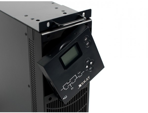 Skat UPS 10000 RACK имеет On-Line, модифицированный синус, световая и звуковая индикация режимов работы, графический дисплей режимов работы, встроенный стабилизатор , защита от всплесков напряжения, защита от перегрузки, длительный резерв, горячая замена АКБ, холодный старт, режим «ECO».