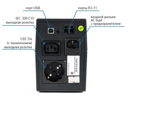 2 выходных разъема: 1 шт. IEC 320 C13 (компьютерный), 1 шт. CEE 7/4 (розетка с заземлением).