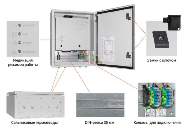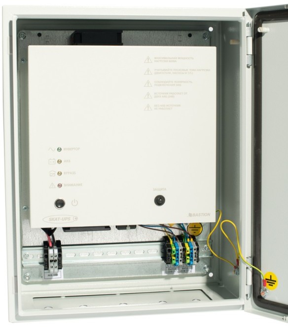 SKAT-UPS 600 IP65 отличается надежностью, удобством и простотой обслуживания и эксплуатации и обеспечивает подключенные к его выходу устройства длительным, стабилизированным электропитанием при отсутствии напряжения сети, используя при этом электроэнергию, запасенную во внешних аккумуляторных батареях.