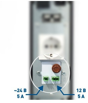 3 выходных разъема: 1 шт. — CEE 7/4 (розетка с заземлением для 220В), 2 шт. - клеммы (для 12В и 24В)