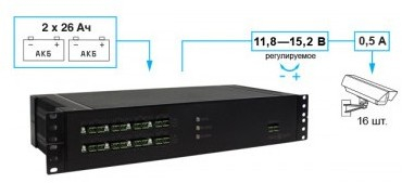 19 ,1U, 2 модуля, 16 выхода по 0,5 А или 8 выходов по 1 А. Плавная регулировка выходного напряжения, максимальный ток по всем выходам 6 А, внешние АКБ 2 шт. от 26 Ач 2 информационных выходов о состоянии источника.