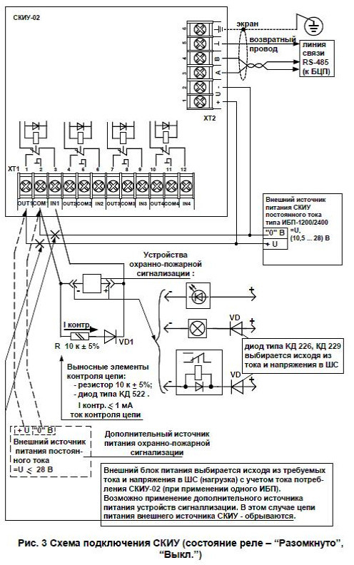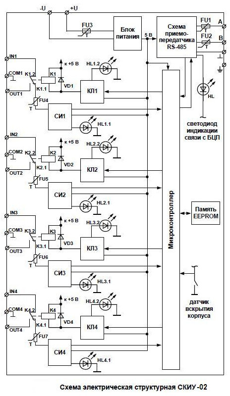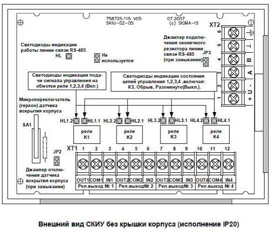 СКИУ-02, корпус IP 20 - сетевой контроллер исполнительных устройств (4 реле НО и НЗ) с контролем состояния цепей управления (состояния - «Разомкнуто», «Короткое замыкание», «Обрыв»), в пластмассовом корпусе, без встроенной консоли управления, со степенью защиты - IP20 входит в состав ИСБ "Индигирка".
