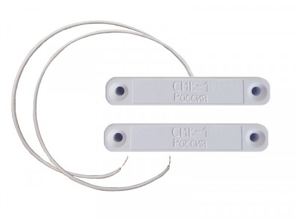 СМК-1 - извещатель охранный точечный магнитоконтактный с нормально-открытого типа (НО) контактами, в корпусе из ABS-пластика, с проводным выводом в обычной изоляции и длиной (0,17м; другая - под заказ) без защитного рукава и предназначенным для организации устройств типа «ловушка», блокировки дверных и оконных проемов, а также других конструктивных магнитопроводящих (металлических) и магнитонепроводящих (алюминиевых, деревянных и т.д.) элементов зданий и сооружений на открывание и смещение с выдачей извещения о тревоге на пульт централизованного наблюдения, прибор приёмно-контрольный или концентратор путем размыкания контактов геркона.