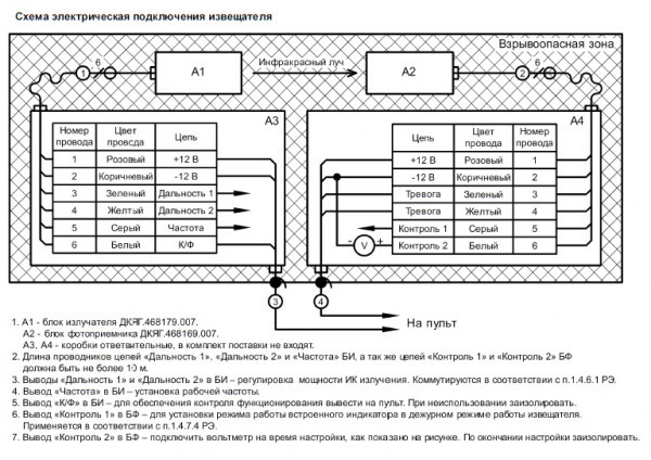 Излучататель и приёмник поставляются с кабелем длиной (1,5м) в металлорукаве (0,3м), кронштейнами для их крепления, защитными козырьками.