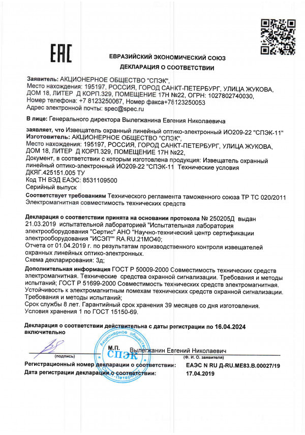 СПЭК-11 - извещатель искробезопасный охранный линейный периметровый однолучевой оптико-электронный (ИК), двухпозиционный (излучатель - БИ и фотоприёмник - БФ), взрывозащищённый (1ExdopisIIBT5GbХ для БИ и 1ExdIIBT5GbX - для БФ), степенью защиты (IP67), дальностью обнаружения - до 150м (открытая площадка) и до 300м (помещение), с высокой помехоустойчивостью, корпусом из металла, окрашенного порошковым методом, предназначен для обнаружения проникновения в охраняемое пространство и формирования извещения о проникновении.