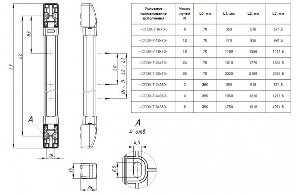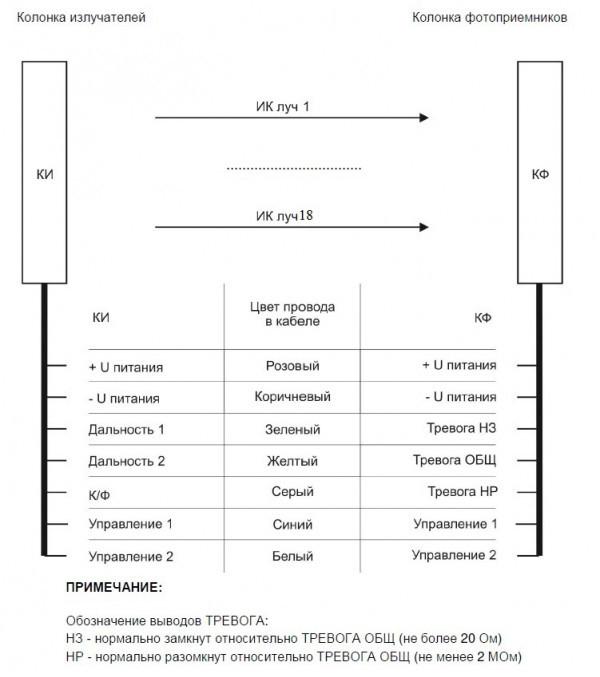 СПЭК-7-18х70 - извещатель охранный линейный оптико-электронный 18-и лучевой активный в составе: колонка излучателей и колонка приёмников с кабельными выводами предназначен для обнаружения проникновения через периметр охраняемого объекта и формирование извещения о тревоге путем переключения (1 НО и НЗ) выходных контактов оптоэлектронного реле.
