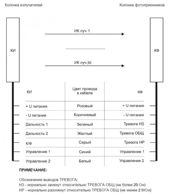 СПЭК-7-30х70 - извещатель охранный линейный оптико-электронный 30-и лучевой активный в составе: колонка излучателей и колонка приёмников с кабельными выводами предназначен для обнаружения проникновения через периметр охраняемого объекта и формирование извещения о тревоге путем переключения (1 НО и НЗ) выходных контактов оптоэлектронного реле.