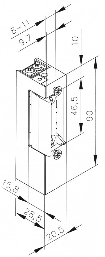 Данная электромеханическая защелка используются совместно с механическими замками с косым ригелем и врезается в дверной косяк вместо стандартной ответной части.