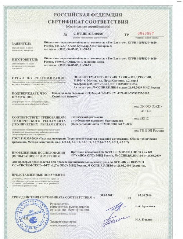 Питание 24В, потребляемый ток свет 17мА, звук 70мА, 103дБ,диапазон раб.температур -40 +50, габариты 300х100х12мм, масса 0,17кг., IP 41.