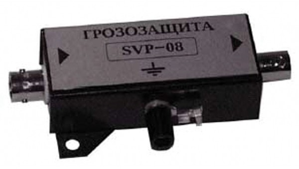 SVP-08 - устройство в корпусе для защиты передающего и приемного оборудования от грозовых разрядов, высоковольтных импульсных наводок и сильных электромагнитных полей обеспечивает шунтирование паразитных электростатических зарядов на шину заземления не только с центральной жилы, но и с оплетки коаксиального кабеля.