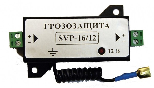 SVP-16/12 - устройство для грозозащиты цепей питания радиотехнического оборудования напряжения 12 VDC (для защиты низковольтных цепей электропитания передающего или приемного оборудования от грозовых разрядов, высоковольтных импульсных наводок и сильных электромагнитных полей) и устанавливаются в разрыв линии питания непосредственно перед защищаемым оборудованием с обязательным заземлением.