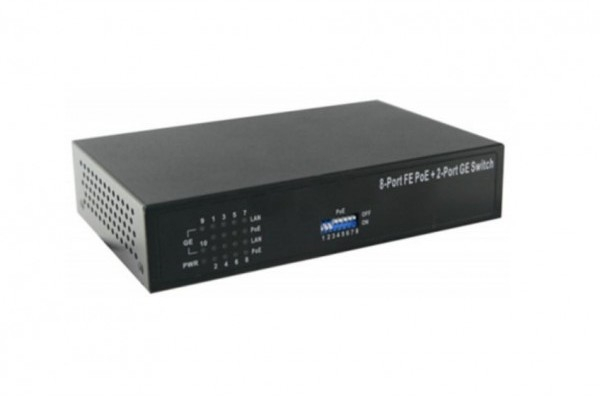 PoE коммутатор Fast Ethernet на 10 портов. Порты 8 x FE (10/100 Base-T) с поддержкой PoE, 2 x GE Uplink (10/100/1000 Base-T). Совместим с оборудованием PoE IEEE 802.3af/at.. Мощность PoE на порт - до 30W. Суммарная мощность PoE до 120W. Питание AC100-240V (120W) Внешний БП. Размеры 188 x 118 x 38 мм. Рабочая температура 0...+50 гр. С.