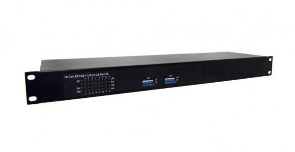 PoE коммутатор Fast Ethernet на 18 портов. Порты 16 x FE (10/100 Base-T) с поддержкой PoE, 1 x GE Uplink (10/100/1000 Base-T), 1 x GE (1000 Base-X) Uplink (SFP). Совместим с оборудованием PoE IEEE 802.3af/at.. Мощность PoE на порт - до 30W. Суммарная мощность PoE - до 250W. Питание AC100-240V. Размеры 480 x 118 x 40 мм. Рабочая температура 0...+50 гр. С.