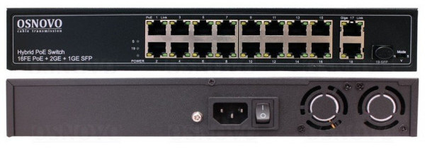 Коммутатор неуправляемый с PoE Fast Ethernet; 16 x FE (10/100 Base-T) с поддержкой PoE (IEEE 802.3af/at/bt), 2 x GE Uplink (RJ45), 1 x GE SFP Uplink; PoE IEEE 802.3af/at; автоматическое определение и режим антизависания PoE устройств. Мощность PoE на 1,2 порту - до 60Вт. Суммарная мощность PoE до 292Вт. Поддержка режима CCTV: Увеличение расстояния передачи данных и питания до 250м, изоляция портов (VLAN); AC100-240В; 300Вт; монтаж в 19 стойку, крепление в комплекте; -10...+55°С; 295x45x195 мм.