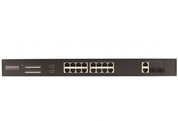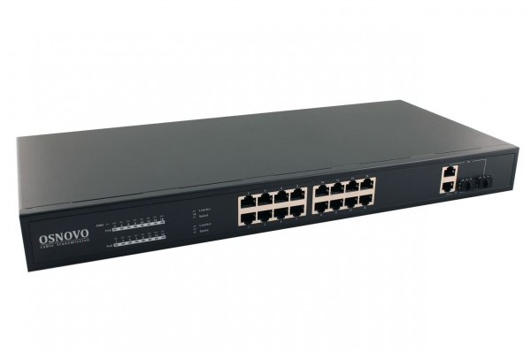 PoE коммутатор Fast Ethernet на 18 портов. Порты: 16 x FE (10/100 Base-T) с поддержкой PoE (IEEE 802.3af/at), 2 x GE Combo Uplink (RJ45 + SFP).