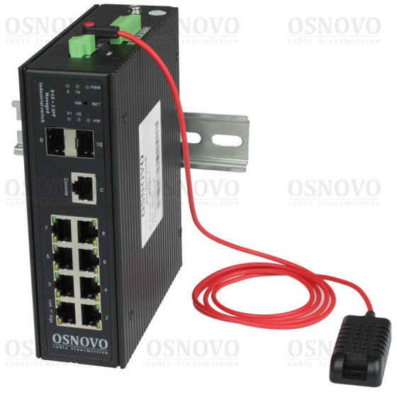 Промышленный управляемый (L2+) коммутатор Gigabit Ethernet на 8GE RJ45 + 2 GE SFP порта с функцией мониторинга температуры/ влажности/ напряжения; Встроенная система мониторинга температуры/ напряжения + внешний датчик температуры/ влажности. Поддержка ПО OSNOVO Monitoring System. Выходы типа "Сухой контакт", Цифровой вход. Встроенная грозозащита 6кВ. DC12-57В(15Вт) 2xвхода . БП в комплект НЕ входит. Монтаж на DIN-рейку или на стену (крепление в комплекте); -40…+80°С; 50х162х130мм.