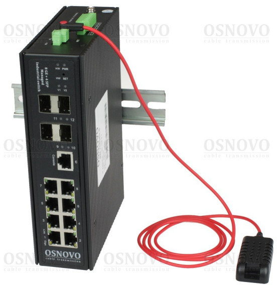 Промышленный управляемый (L2+) коммутатор Gigabit Ethernet на 8GE RJ45 + 4 GE SFP порта с функцией мониторинга температуры/ влажности/ напряжения; Встроенная система мониторинга температуры/ напряжения + внешний датчик температуры/ влажности. Поддержка ПО OSNOVO Monitoring System. Выходы типа "Сухой контакт", Цифровой вход. Встроенная грозозащита 6кВ. DC12-57В(15Вт)2 x входа . БП в комплект НЕ входит. Монтаж на DIN-рейку или на стену (крепление в комплекте); -40…+80°С; 50х187х130мм.